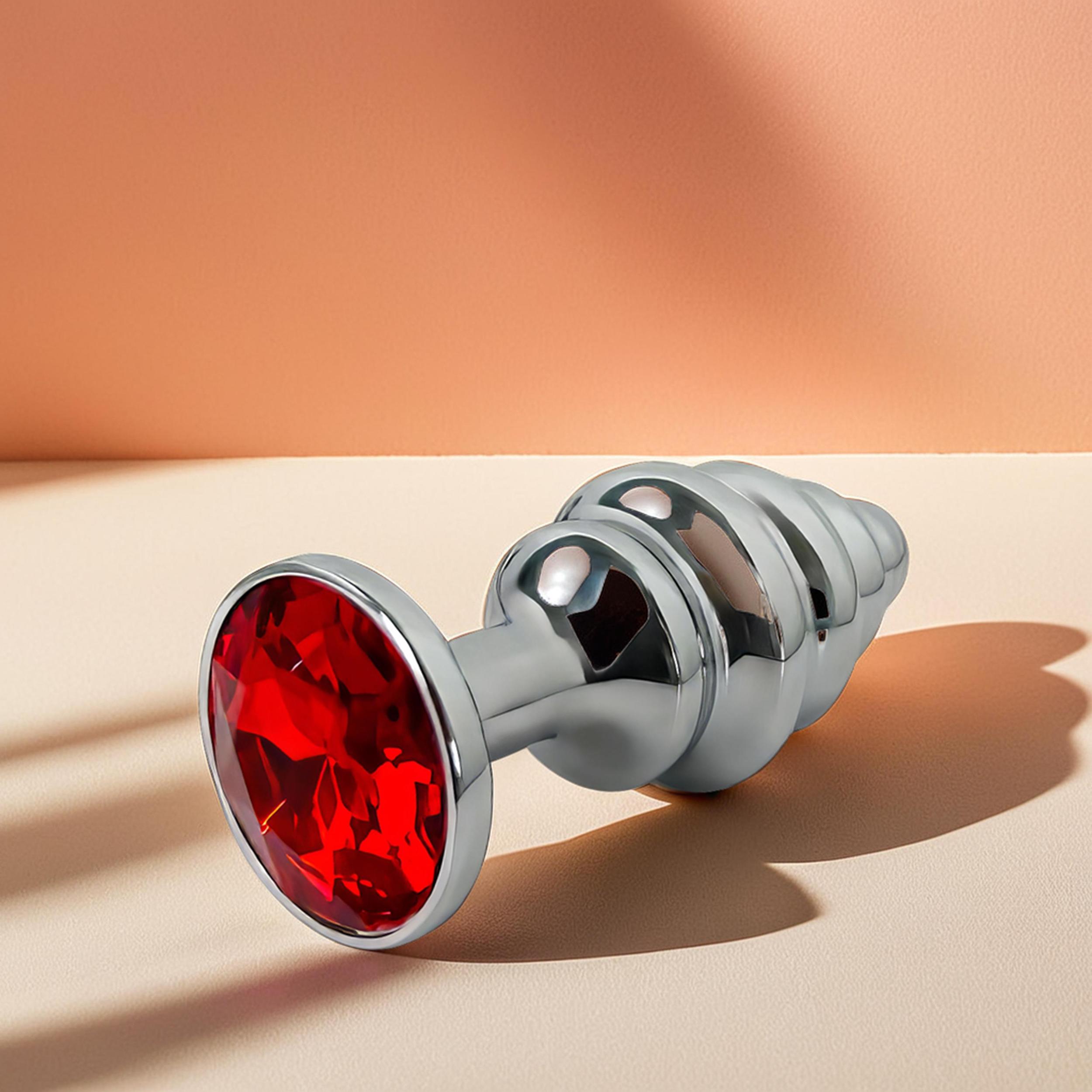 Анальная пробка металлическая ребристая с красным кристаллом Fantasy Toys (S)