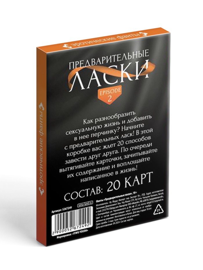 В этой коробке — 20 способов завести друг друга. По очереди вытягивайте карточки, читайте задание и воплощайте в реальность. Никакой сложной подготовки, никаких правил — только вы, партнёр и лёгкое дыхание азарта.