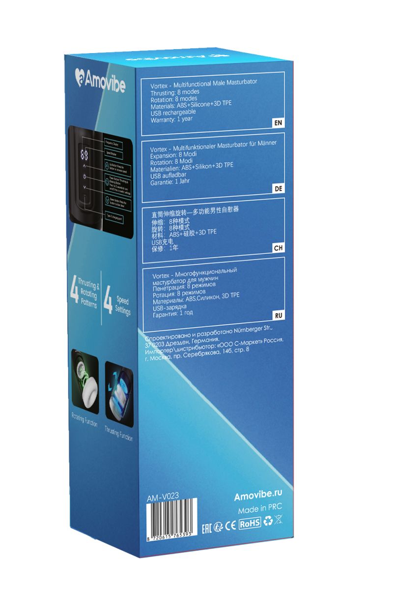 Vortex- мастурбатор нового поколения с одновременной стимуляцией ствола и головки члена. Верхняя часть мастурбатора создает вращение на головке, а движущееся кольцо стимулирует ствол члена. Высокотехнологичные моторы обеспечивают 4 уникальных стиля стимуляции и 4 разные скорости.