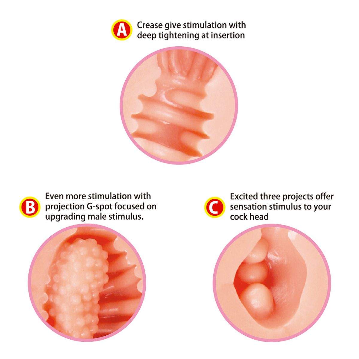 Крупный мастурбатор с узорами на внешней стороне, рельефной точкой G, складками и тремя шариками для стимуляции головки пениса.