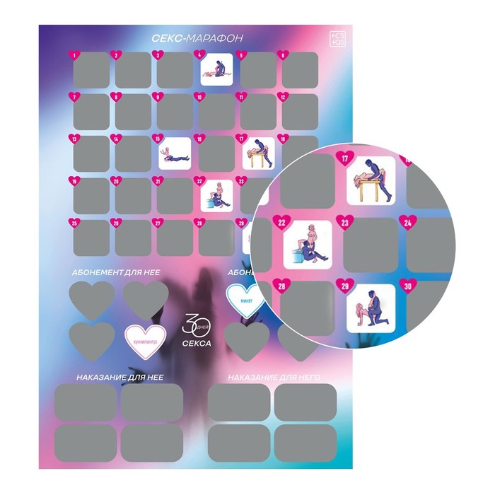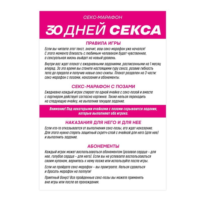 В программе вас ждёт целый месяц с секс - позами: от простых и классических до нестандартных и сложных, а также наказания и абонементы желаний для обоих партнёров.