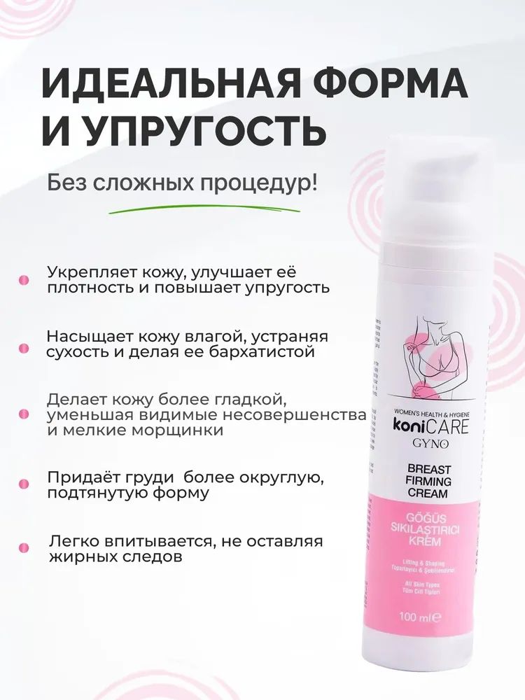 Крем для упругости груди Konicare Gyno крем для упругости груди – это ухаживающий крем, который придает упругий вид области груди и декольте. Он помогает предотвратить обвисание в области груди, которая потеряла свою упругость. Способствует тому, чтобы кожа стала более подтянутой и приобрела форму. Применение: перед нанесением убедитесь, что кожа чистая и достаточно сухая. Наносите утром и/или вечером на область груди, массируя. Втирайте круговыми движениями, завершая нанесение движениями вверх по направлению к шее.